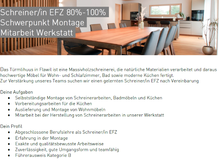 Werde Teil unseres Teams: Schreiner/in EFZ (80%–100%) Schwerpunkt Montage und Mitarbeit Werkstatt Das Türmlihuus in Flawil steht für echte Handwerkskunst. Als Massivholzschreinerei verarbeiten wir natürliche Materialien zu hochwertigen Möbeln für Wohn- und Schlafzimmer, Bäder sowie moderne Küchen. Wir suchen zur Verstärkung unseres Teams einen gelernten und motivierten Schreiner (m/w/d) nach Vereinbarung. Deine Aufgaben: Du bist verantwortlich für die selbstständige Montage von Schreinerarbeiten, Badmöbeln und hochwertigen Küchen. Du bringst unsere handgefertigten Wohnmöbel sicher zu unseren Kunden und montierst sie vor Ort. Wenn du nicht gerade auf Montage bist, unterstützt du uns bei der Herstellung unserer Möbel direkt in unserer Werkstatt in Flawil. Das bringst du mit: Abgeschlossene Berufslehre als Schreiner/in EFZ. Du hast Freude an echtem, einheimischen Holz. Du bringst fundierte Erfahrung in der Montage mit und weisst, worauf es beim Kunden ankommt. Du arbeitest exakt, qualitätsbewusst und hast ein Auge fürs Detail. Zuverlässigkeit, gute Umgangsformen und Teamgeist sind für dich […]