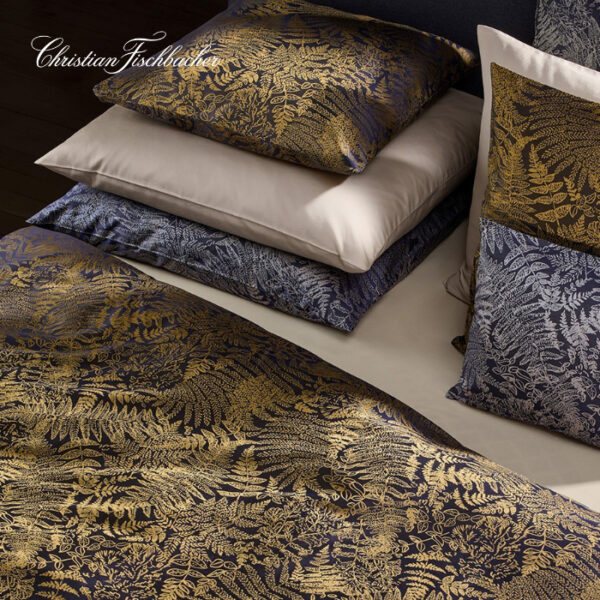 Vor vielen Millionen von Jahren bildeten Farne riesige Wälder, deren vielfältige Formen und Arten bis heute bestehen. Gezeichnete Farnmotive wurden zu einem faszinierenden Design verdichtet. Daraus entstand ein wunderbar changierendes Gewebe auf dunkler Kette, welches in Gold, Silber und irisierendem Hellblau erstrahlt und beidseitig eingesetzt werden kann. Das ausgewogene Verhältnis von Kett- und Schusssatin verleiht Farn einen angenehm weichen Griff.