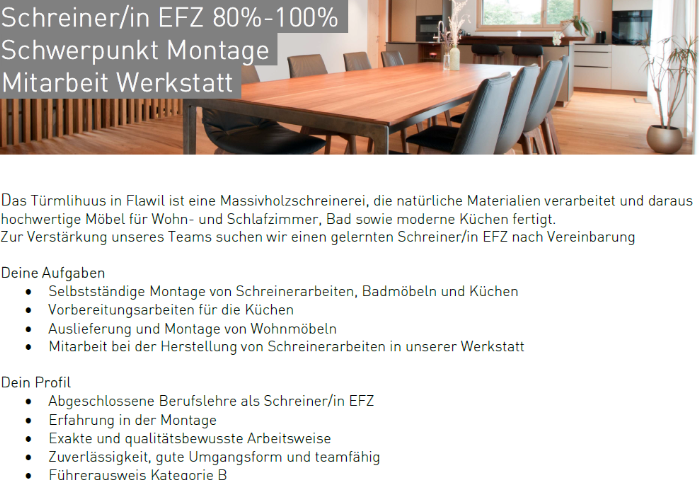 Das Türmlihuus in Flawil steht für echte Handwerkskunst. Als Massivholzschreinerei verarbeiten wir natürliche Materialien zu hochwertigen Möbeln für Wohn- und Schlafzimmer, Bäder sowie moderne Küchen. Wir suchen zur Verstärkung unseres Teams einen gelernten und motivierten Schreiner (m/w/d) nach Vereinbarung.